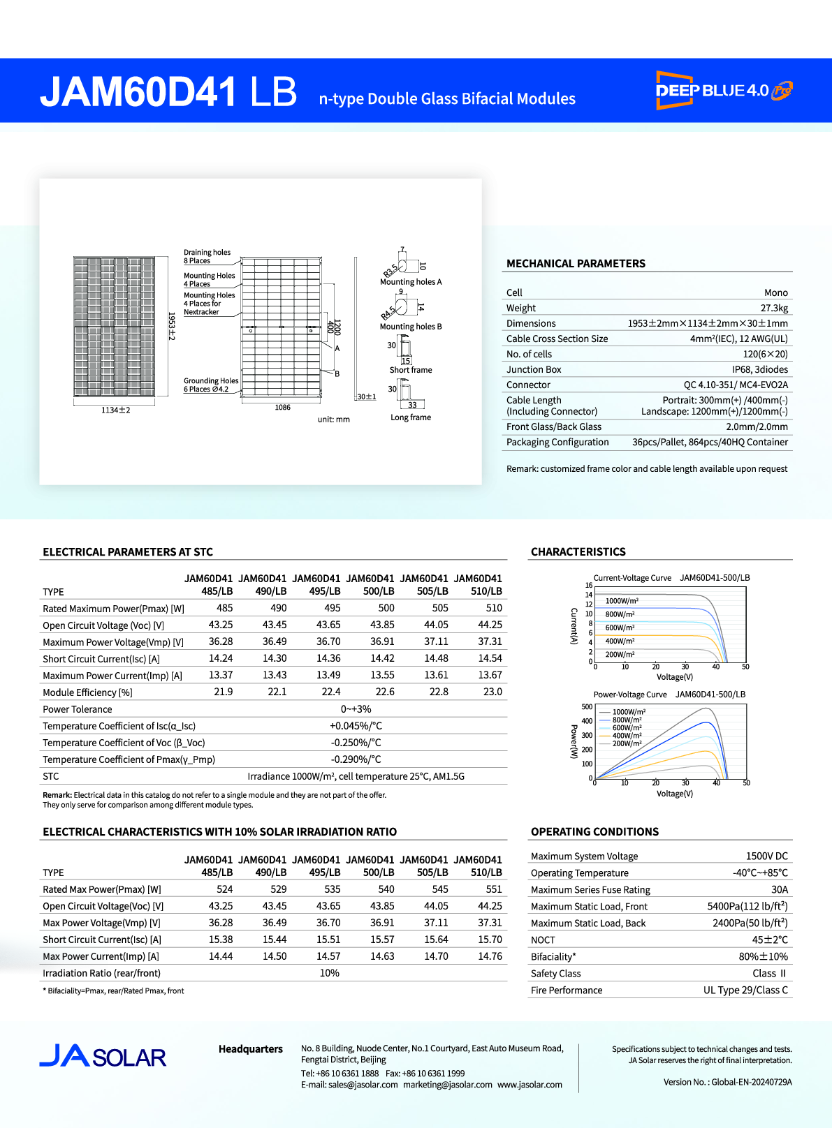 JA Solar PV Modul Panel 500W N type Bifazial All Black MC4